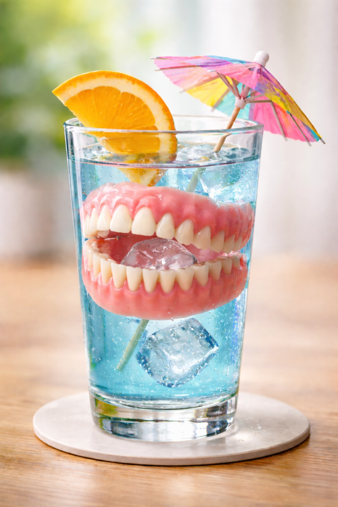 C’è un’immagine che appartiene all’immaginario di tutti: la dentiera nel bicchiere.